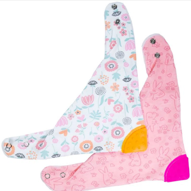 2 Baberos doble vista con reverso en toalla, broches ajustables y suave mordedera.